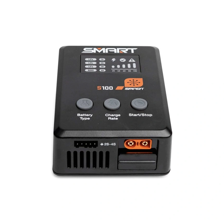 usuário e capacidade de carregar rapidamente baterias Smart nas portas de saída integradas IC3® ou IC5® , o carregador S100 oferece uma experiência de carregamento versátil e verdadeiramente descomplicada. Você pode carregar praticamente qualquer bateria de RC com o carregador S100. Use-o com baterias Smart e você se surpreenderá com sua incrível funcionalidade e desempenho. O carregador USB-C S100 Smart torna o carregamento de baterias mais fácil do que nunca. Seu recurso de Carregamento Automático reconhece os parâmetros da sua bateria Smart, como tipo de química e taxa de carga, e inicia o carregamento seguro e correto automaticamente quando o cabo de carregamento é conectado. Balancear baterias Smart é igualmente simples. O carregador S100 balanceia suas baterias Smart G2 através da mesma conexão IC usada para o carregamento. Não são necessários cabos de balanceamento separados e complicados. Alimentado por um cabo USB-C incluso, o S100 é uma solução de carregamento conveniente para iniciantes no RC. Tudo o que você precisa é um adaptador de energia USB-C comum e você está pronto para usar.